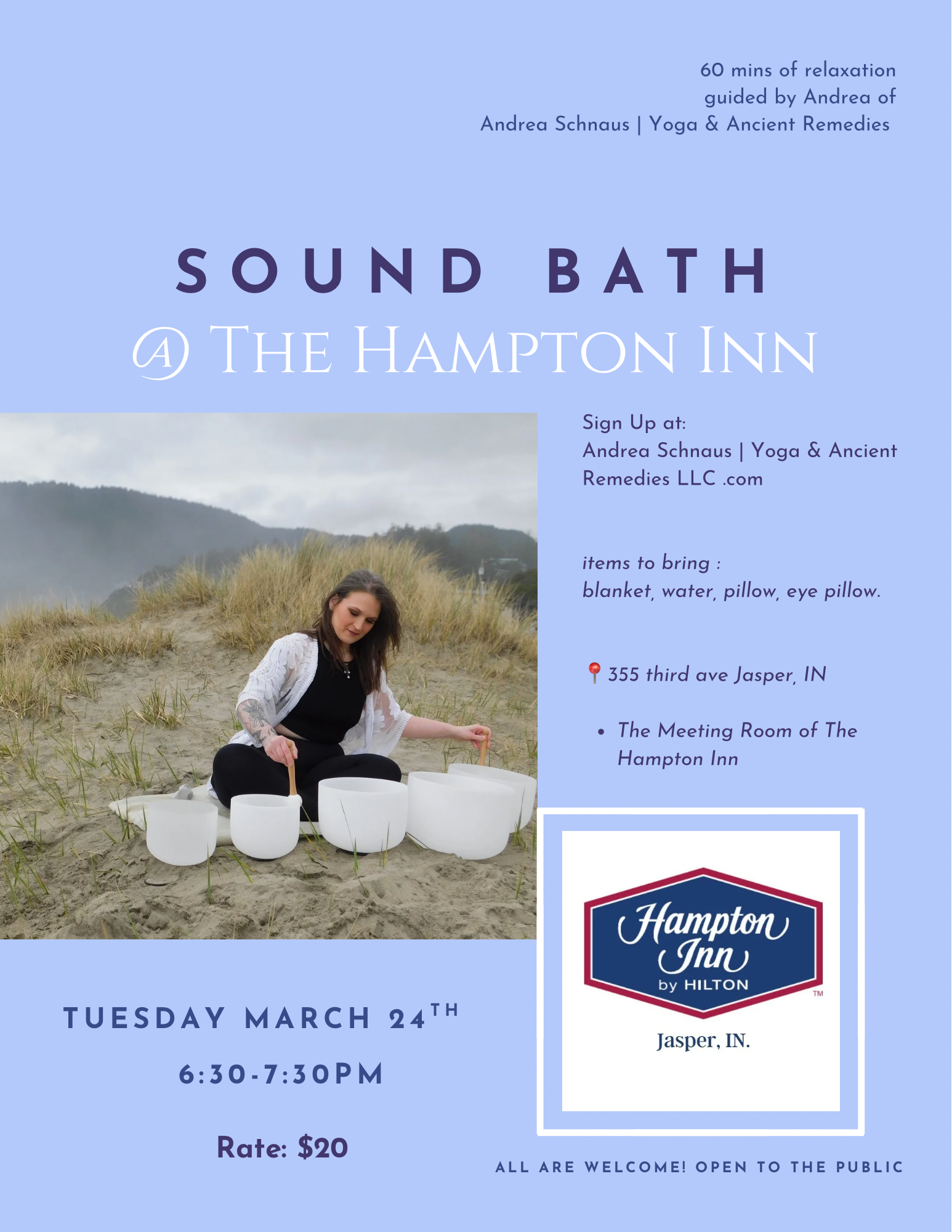 Embrace the power of sound, let Andrea guide you to a state of deep relaxation and rejuvenation. The use of Crystal singing bowls + Chimes.